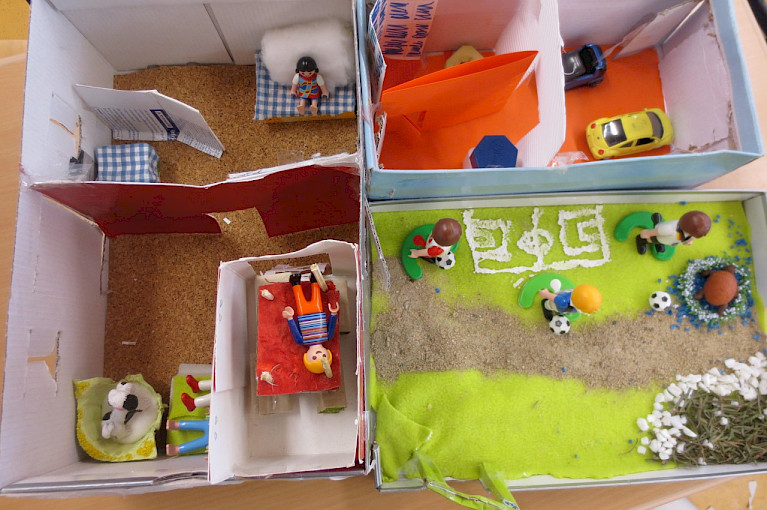 Das von der BK-Lehrerin Marion Schnurr gestellte Thema in Klasse R5b und R6a lautete, aus einem Schuhkarton mit Deckel ein Traumhaus mit Inneneinrichtung und Garten zu errichten.