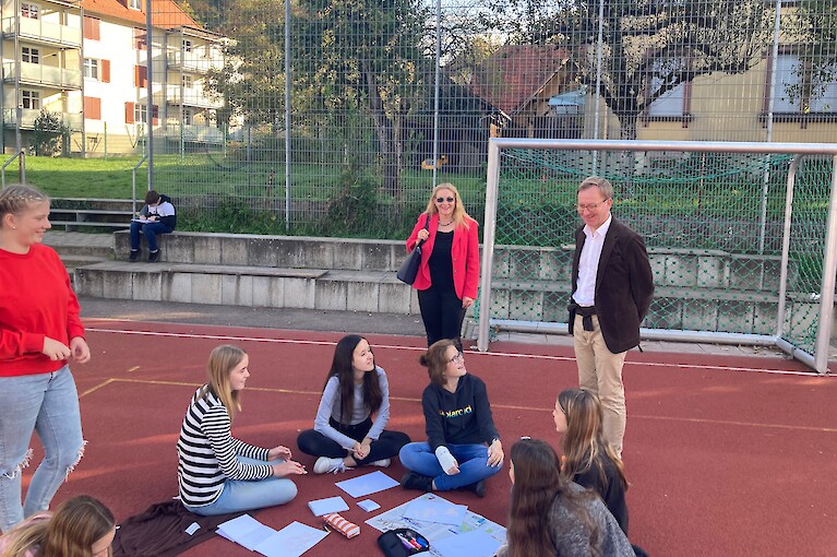 Am Dienstag, den 18. Oktober war unser Schulhof dank der Herbstsonne auch außerhalb der Pausenzeiten sehr belebt. Zu mehreren Schulklassen gesellten sich Besucher aus den Niederlanden und aus dem Rathaus.